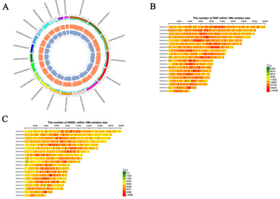 Figure 2. Distribution of variant genes across chromosomes. (A) Genome-wide distribution of variant genes. (B). Chromosomal density distribution of genes containing SNP variants. (C). Chromosomal density distribution of genes containing InDel variants.