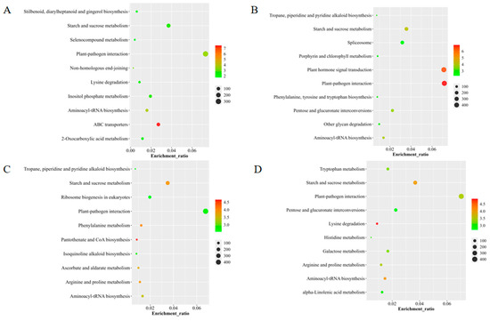 Figure 3. Variant genes enriched in KEGG pathways. (A). C. ensifolium. (B). C. floribundum. (C). C. kanran. (D). C. sinense.