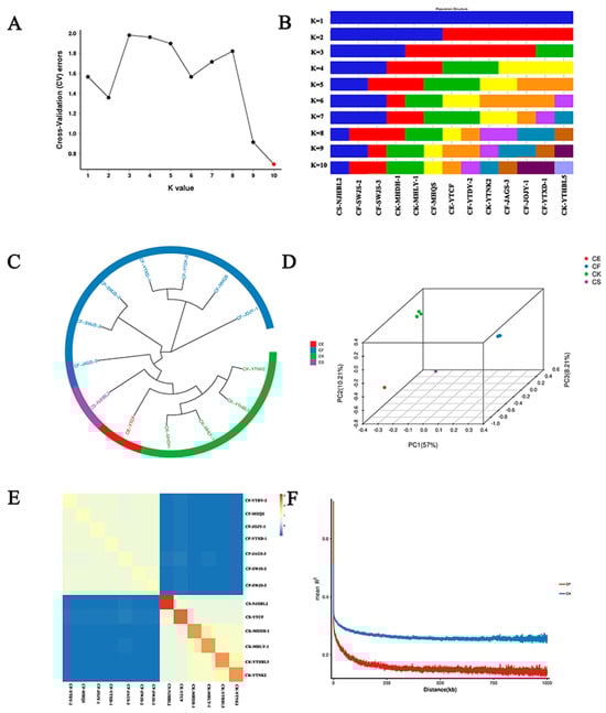 Figure 4. Genetic evolutionary relationships of four Cymbidium species from Fujian. (A). Cross-validation error rate of K value. (B). Clustering results of samples corresponding to each K value. (C). NJ phylogenetic tree of four Cymbidium species. (D). 3D principal component analysis (PCA) clustering. (E). Heatmap of genetic relatedness. (F). Linkage disequilibrium (LD) decay patterns among populations.