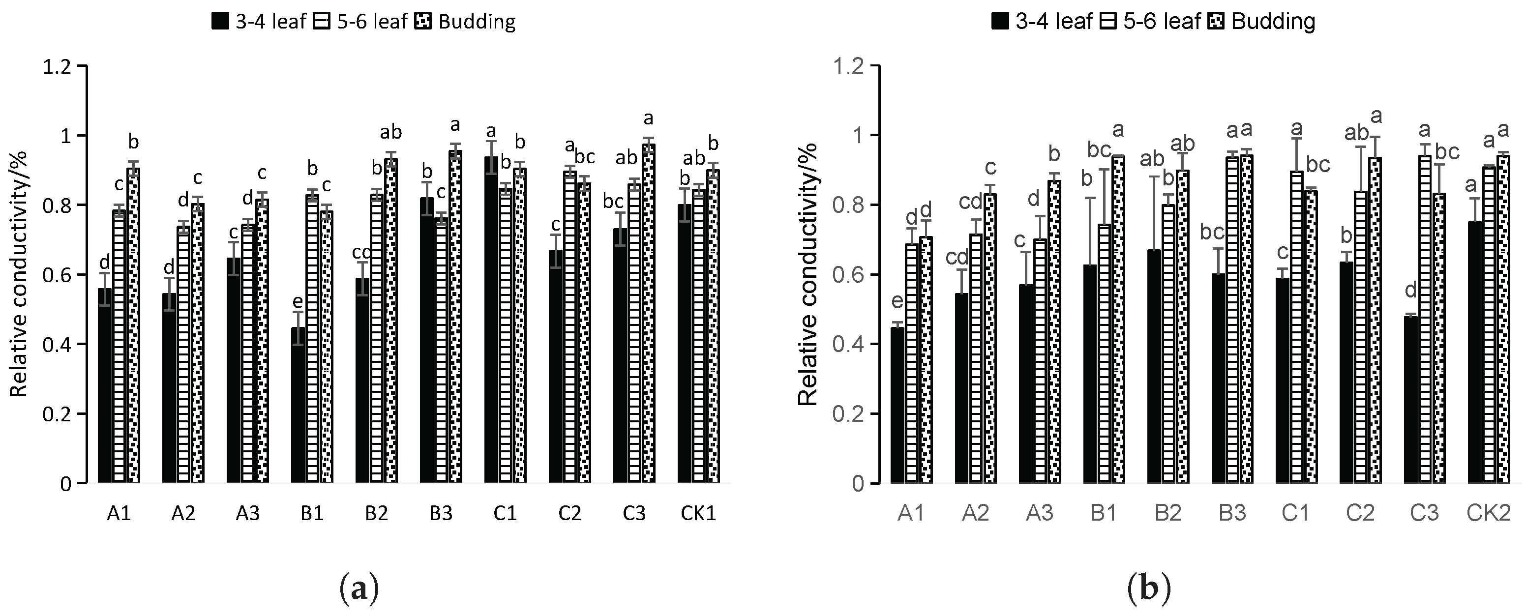 - Chen, A.; Han, R.; Li, D.; Ling, L.; Luo, H.; Tang, S. Comparative study on the determination methods of relative electrical conductivity of plant leaves. J. Guangdong Educ. Inst. 2010, 30, 88–91. [Google Scholar]
