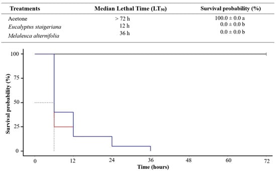 Mortality of Tuta absoluta caterpillars, over time, treated topically with the essential oils of Eucalyptus staigeriana (red line) and Melaleuca alternifolia (blue line) at a dose of 120 µL of essential oil/caterpillar. Means in the same line followed by different letters differ from each other (p < 0.05).