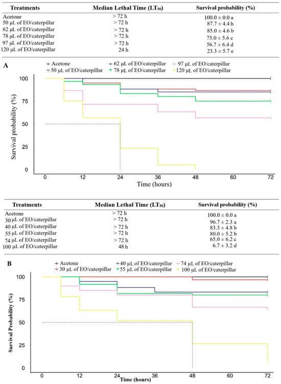 Survival analysis, over time, of Tuta absoluta caterpillars that were topically treated with different doses of the essential oils of (A) Eucalyptus staigeriana, and (B) Melaleuca alternifolia. EO: essential oil. Means in the same line followed by different letters differ from each other (p < 0.05).