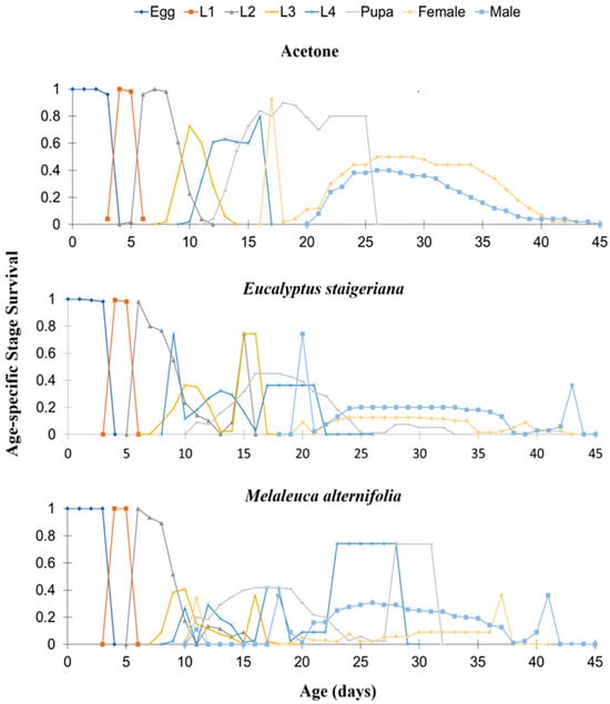 Age-specific survival rate (sxj) of Tuta absoluta in the acetone treatments, Melaleuca alternifolia (76.5 µL of essential oil/caterpillar), and Eucalyptus staigeriana (78.5 µL of essential oil/caterpillar). L1 = first-instar caterpillar, L2 = second-instar caterpillar, L3 = third-instar, and L4 = fourth-instar caterpillar.