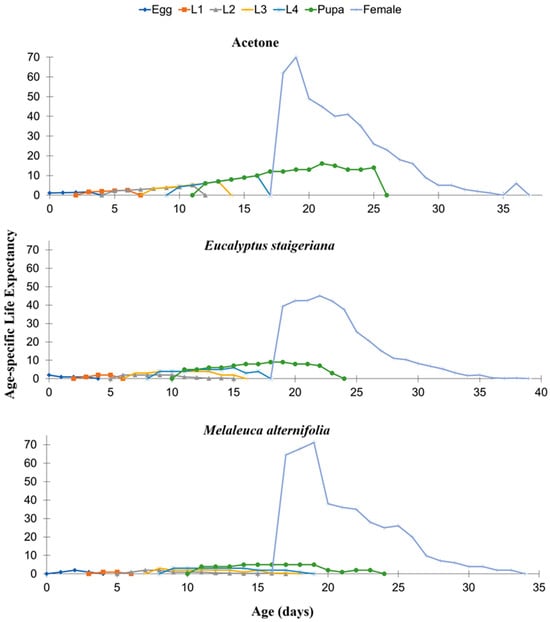 Age-specific life expectancy (exj) of Tuta absoluta in the acetone, Melaleuca alternifolia (76.5 µL of essential oil/caterpillar), and Eucalyptus staigeriana (78.5 µL of essential oil/caterpillar) treatments. L1 = first-instar caterpillar, L2 = second-instar caterpillar, L3 = third-instar, and L4 = fourth-instar caterpillar.