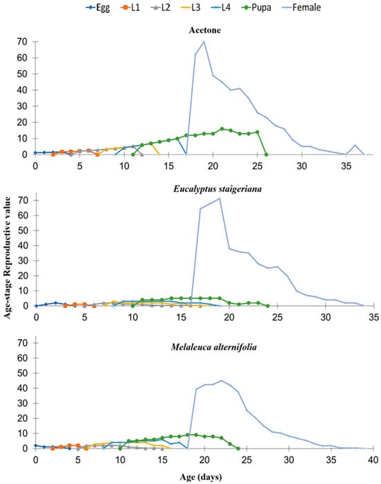 Reproductive value by age (vxd) of Tuta absoluta in the acetone, Eucalyptus staigeriana (78.5 µL of essential oil/caterpillar), and Melaleuca alternifolia (76.5 µL of essential oil/caterpillar) treatments. L1 = first-instar caterpillar, L2 = second-instar caterpillar, L3 = third-instar, and L4 = fourth-instar caterpillar.