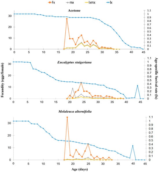 Age-specific survival rate (lx), age-specific fertility, and stage of development (fx), age-specific fertility (mx) and age-specific maternity (lxmx) of Tuta absoluta in the acetone, Melaleuca alternifolia (76.5 µL of essential oil/caterpillar), and Eucalyptus staigeriana (78.5 µL of essential oil/caterpillar) treatments.