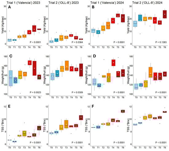 Graphical depiction of selected variables. Yield (A,B), fruit weight (C,D), and TSS (E,F) of ‘Valencia’ and ‘OLL-8’ trees subjected to different injection treatments measured in 2023 and 2024. For statistical details, refer to Table 5 and Table 6. Data are presented as boxplots with median, interquartile range, and outliers.
