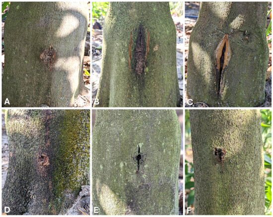 Typical wound phenotypes after drill-free (A–C) and drill-based injection (D,E). (A–E), rootstock injection; (F) = scion injection. Note moderate to no bark cracking in (A,D–F) and more extensive bark cracking in (B,C).