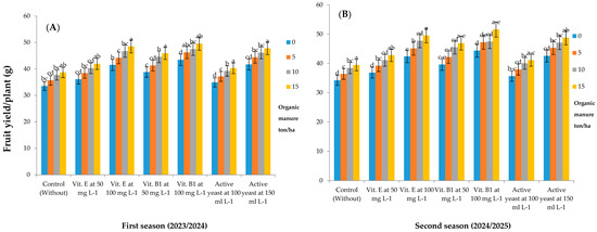 (A,B). Effects of organic manure, vitamin E, vitamin B1, and active yeast treatments on fruit yield/plant (g) of caraway plants during the two growing seasons (2023/24 and 2024/25). The data are statistically different, according to the Duncan Multiple Range Test (DMRT) at p ≤ 0.05. Interactions are indicated by lowercase letters, unless otherwise mentioned.