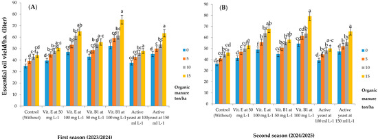 (A,B). Effects of organic manure, vitamin E, vitamin B1, and active yeast treatments on essential oil yield/ha (l) of caraway plants during the two growing seasons (2023/24 and 2024/25). The data are statistically different, according to the Duncan Multiple Range Test (DMRT) at p ≤ 0.05. Interactions are indicated by lowercase letters, unless otherwise mentioned.
