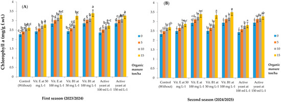 (A,B). Effects of organic manure, vitamin E, vitamin B1, and active yeast treatments on chlorophyll a (mg/g f.w.) of caraway plants during the two growing seasons (2023/24 and 2024/25). The data are statistically different, according to the Duncan Multiple Range Test (DMRT) at p ≤ 0.05. Interactions are indicated by lowercase letters, unless otherwise mentioned.