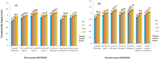 (A,B). Effects of organic manure, vitamin E, vitamin B1, and active yeast treatments on carotenoids (mg/g. f.wt.) of caraway plants during the two growing seasons (2023/24 and 2024/25). The data are statistically different, according to the Duncan Multiple Range Test (DMRT) at p ≤ 0.05. Interactions are indicated by lowercase letters, unless otherwise mentioned.