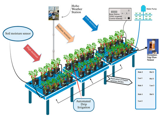 Although the effects of drought on chili peppers have been investigated, few studies have examined how specific volumetric soil moisture content (VSMC) levels influence the physiological and biochemical traits of Capsicum chinense across different varieties under water-limited conditions—particularly using advanced tools such as soil moisture and sap flux sensors. For instance, Sun et al. [25] used a 10HS capacitance sensor (Decagon Devices, Pullman, WA, USA) to evaluate the effects of 15%, 25%, 35%, and 45% VSMC on three chili pepper varieties, whereas Pedroza-Sandoval et al. [26] assessed two varieties under VSMC levels of 20% and 25%, with soil moisture monitored in real time using a digital tensiometer (MO750, Extech Instruments Co., Laredo, TX, USA). However, there is a lack of research exploring chili pepper performance under lower VSMC thresholds (<21%) with precise, sensor-based irrigation management, which could yield valuable insights into cultivar-specific water-use strategies and their effects on yield and quality. Recent studies have demonstrated the increasing application of sap flux and sap flow sensor technologies in horticultural crops, particularly under controlled or semi-controlled environments. For instance, Zhang et al. [27] developed a flexible, plant-wearable sap flow sensor to monitor water transport dynamics in watermelon fruit stalks across different developmental stages, offering real-time physiological insights that can enhance fruit growth monitoring and irrigation precision. Mancha et al. [28] validated the use of sap flow sensors against weighing lysimeters in vineyards, demonstrating strong agreement (R2 = 0.85) and supporting their use in quantifying vine transpiration under different irrigation strategies. However, despite these advancements, sap flow sensing technologies have not yet been applied to chili pepper (Capsicum spp.) under greenhouse conditions—a high-value crop that is highly sensitive to water availability. This presents a critical gap in the literature, particularly given the need for precise, crop-specific irrigation strategies in protected cultivation systems. To address the challenges posed by water stress, sensor-based irrigation technologies have emerged as effective solutions. Systems utilizing soil moisture sensors, sap flow sensors, and automated irrigation controllers allow the real-time monitoring of plant and soil water status, enabling precise and timely irrigation decisions. Technologies such as Hydra Probe sensors and Arduino-based automated irrigation systems have been successfully implemented in controlled environment agriculture to improve water-use efficiency and optimize crop growth [29,30,31]. While soil moisture and environmental sensors are commonly used, the application of sap flux sensors for monitoring plant water status remains largely underexplored in hot pepper cultivation. Sap flux measurement provides a direct, real-time indicator of whole-plant transpiration and internal water movement, offering critical insight into plant physiological responses to irrigation. By integrating sap flux monitoring in chili peppers, this study introduces a novel approach that enables the dynamic assessment of plant water demand, paving the way for more responsive and efficient irrigation strategies. These sensor-driven systems not only allow to conserve water but can promote consistent physiological performance and enhanced fruit quality under variable environmental conditions, offering a sustainable path forward for hot pepper production.