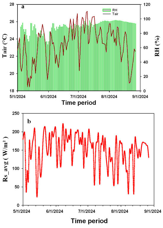 Environmental conditions recorded in the greenhouse from 1 May 2024 to 1 September 2024, air temperature (Tair) (°C) with relative humidity (RH) (a) and average daily solar radiation (Rs_avg) (b).