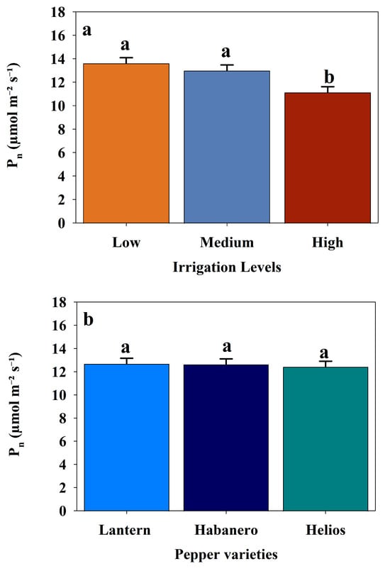 Average photosynthetic rate (Pn) among three irrigation levels, i.e., low irrigation levels (15% VSMC), medium irrigation levels (18% VSMC), and high irrigation levels (21% VSMC) (a), among three hot pepper varieties (Lantern, Habanero, and Helios) (b) all during the 2024 growing season, respectively. Error bars represent standard error, and different letters indicate statistically significant differences (p < 0.05).