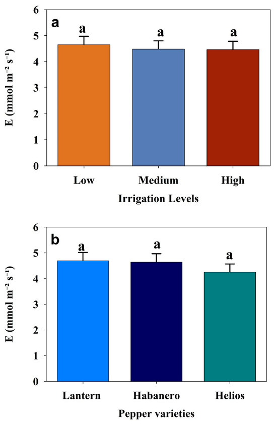 Average transpiration rate (E) among three irrigation levels, i.e., low irrigation levels (15% VSMC), medium irrigation levels (18% VSMC) and high irrigation levels (21% VSMC) (a), among three hot pepper varieties (Lantern, Habanero, and Helios) (b) during the 2024 growing season, respectively, Error bars represent standard error, and different letters indicate statistically significant differences (p < 0.05).