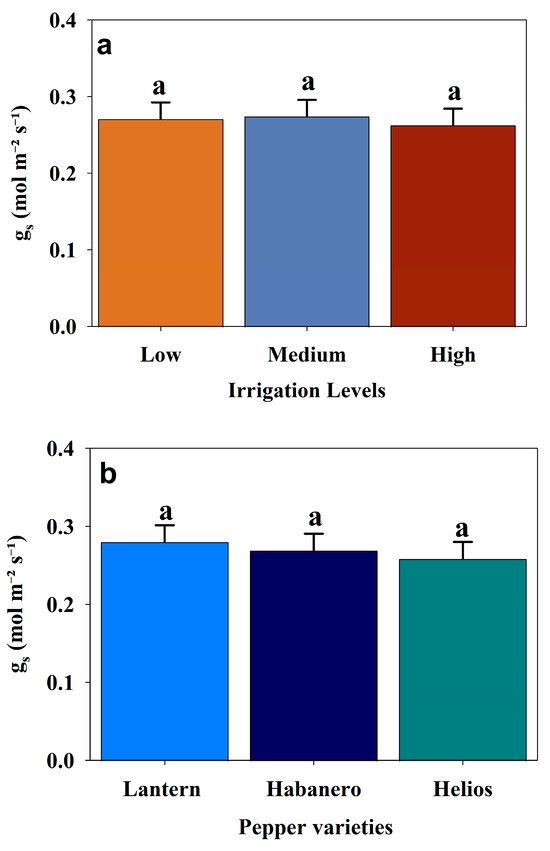 Average stomatal conductance rate (gs) among three irrigation levels, i.e., low irrigation levels (15% VSMC), medium irrigation levels (18% VSMC), and high irrigation levels (21% VSMC) (a), among three hot pepper varieties (Lantern, Habanero, and Helios) (b) during the 2024 growing season, respectively. Error bars represent standard error, and different letters indicate statistically significant differences (p < 0.05).