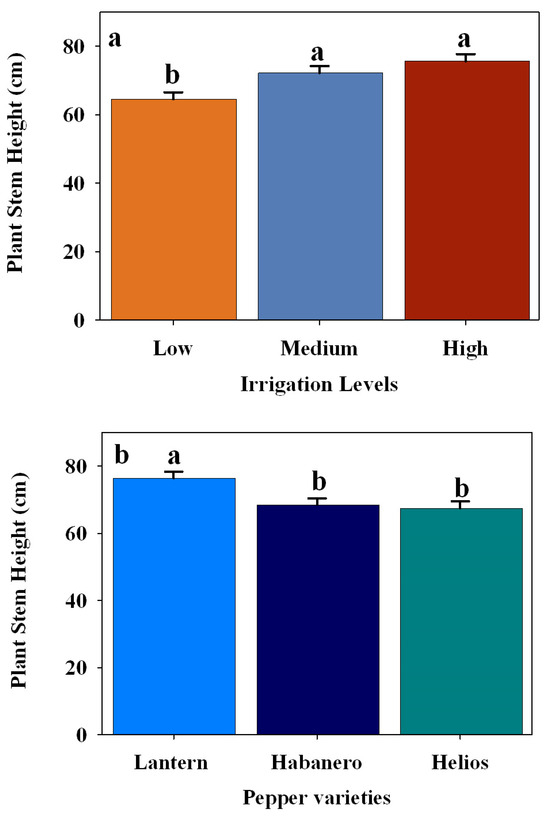 Average pepper stem height (cm) among three irrigation levels, i.e., low irrigation levels (15% VSMC), medium irrigation levels (18% VSMC), and high irrigation levels (21% VSMC) (a), among three hot pepper varieties (Lantern, Habanero, and Helios) (b) during the 2024 growing season, respectively. Error bars represent standard error, and different letters indicate statistically significant differences (p < 0.05).