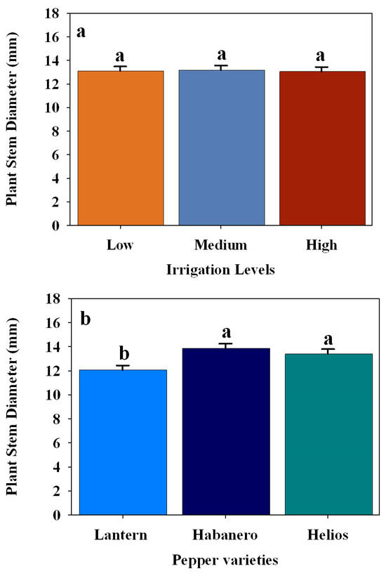 Average pepper stem diameter (mm) among three irrigation levels, i.e., low irrigation levels (15% VSMC), medium irrigation levels (18% VSMC), and high irrigation levels (21% VSMC) (a), among three hot pepper varieties (Lantern, Habanero, and Helios) (b) during the 2024 growing season, respectively. Error bars represent standard error, and different letters indicate statistically significant differences (p < 0.05).