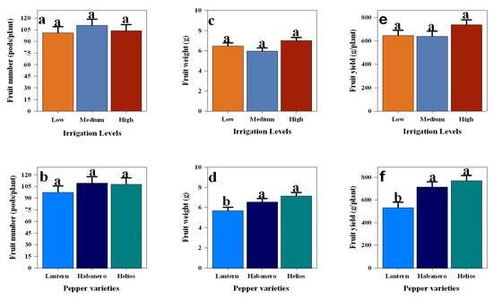 Average yield components of hot pepper during the 2024 growing season: (a) average number of fruits (pods/plant) under different irrigation treatments; (b) average number of fruits across pepper varieties; (c) average fruit weight (g) under different irrigation treatments; (d) average fruit weight across pepper varieties; (e) average fruit yield (g/plant) under different irrigation treatments; (f) average fruit yield across pepper varieties. Error bars represent standard error, and different letters indicate statistically significant differences (p < 0.05).