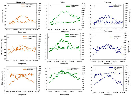 Volumetric soil moisture content (VSMC) (% VWC) and sap flux rate (g d−1) among three irrigation levels—low irrigation (15% VWC) for Habanero (a), Helios (b), and Lantern (c); medium irrigation (18% VWC) for Habanero (d), Helios (e), and Lantern (f); and high irrigation (21% VWC) for Habanero (g), Helios (h), and Lantern (i)—during the 2024 growing season. Brown represents Habanero, green represents Helios, and blue represents Lantern. Dotted lines represent soil moisture and solid lines represent sap flux.