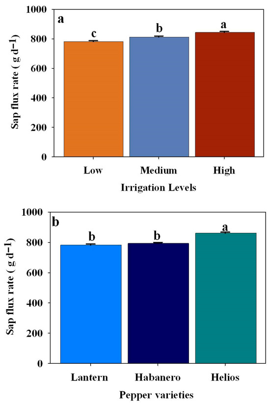 Daily average sap flux rate (g d−1) among three irrigation levels, i.e., low irrigation (15% VSMC), medium irrigation (18% VSMC), and high irrigation (21% VSMC) (a), three hot pepper varieties (Lantern, Habanero, and Helios) (b) during the 2024 growing season, respectively. Error bars represent standard error, and different letters indicate statistically significant differences (p < 0.05).