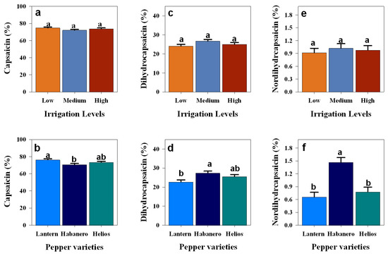 Average capsaicin (%) among irrigation levels (a) and pepper varieties (b); average dihydrocapsaicin (%) among irrigation levels (c) and pepper varieties (d); average nordihydrocapsaicin (%) among irrigation levels (e) and pepper varieties (f) during the 2024 growing season. Irrigation levels include low (15% VSMC), medium (18% VSMC), and high (21% VSMC), and pepper varieties include Lantern, Habanero, and Helios. Error bars represent standard error, and different letters indicate statistically significant differences (p < 0.05).