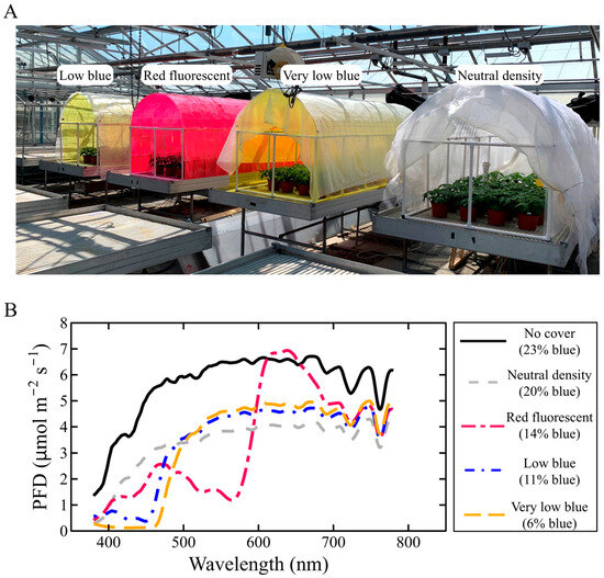 Each chamber was covered with either a common neutral density polyethylene greenhouse plastic (Standard clear 6 mil film; Greenhouse Mega Store, Danville, IL, USA), an experimental red-fluorescent film (as described in [14]), or a photoselective film (not developed specifically for plant applications) that transmitted 6 or 11% of the photons between 400 and 499 nm (Calcolor 90 Yellow and Cinelux Daffodil; Rosco Laboratories Inc., Stamford, CT, USA). The 6% and 11% B treatments are referred to as ‘very low blue’ and ‘low blue’ henceforth. Varying layers of 11% and 40% neutral density shading materials (ProtekNet; Johnny’s Selected Seeds and Harmony 2047 FR; Ludvig Svensson Inc., Charlotte, NC, USA) were used to cover the chambers to match the transmission PPFD among the four covered treatments. In addition to the four chambers, a greenhouse bench with no chamber or covering material was used as a greenhouse control treatment. We used a spectroradiometer (LI-180 Spectrometer; LI-COR, Inc., Lincoln, NE, USA) to measure treatment transmission spectra on a cloudless day at solar noon (n = 10). The photon spectrum for each treatment is depicted in Figure 1B and Table S1.