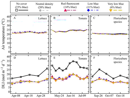 The research greenhouse was controlled by an environmental control system (Integro 725; Priva, De Lier, The Netherlands) with a constant setpoint of 21 °C and ambient CO2 concentration. Steam heat, evaporative cooling pads, exhaust fans, and roof vents regulated the greenhouse air temperature. Each greenhouse bench (i.e., an experimental unit) contained one aspirated and shielded thermocouple (Type E; Omega Engineering, Inc., Stamford, CT, USA) and one quantum sensor (LI-190SA; LI-COR, Inc.) maintained at canopy height for the duration of the experiment. Air temperature and instantaneous PPFD were measured every minute with a data logger (CR-1000; Campbell Scientific, Logan, UT, USA) and hourly averages were recorded. Average weekly air temperature and daily light integral (DLI; mol∙m−2∙d−1) data are displayed in Figure 2A–F and Table S2. Average weekly air temperature differences among greenhouse benches were <0.5 °C (Figure 2A–C). Average DLI values among the four covered treatments were within 0.5 mol∙m−2∙d−1 but the average DLI for the uncovered greenhouse control treatment was 7–12 mol∙m−2∙d−1 greater than the covered treatments (Figure 2D,E).