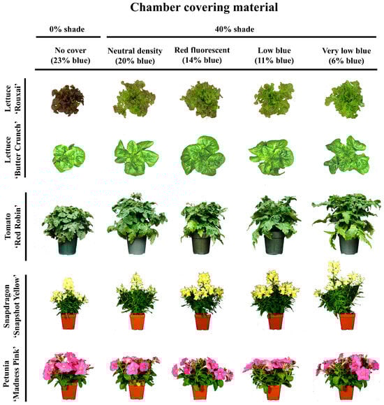 The following supporting information can be downloaded at: https://www.mdpi.com/article/10.3390/horticulturae11080980/s1, Figure S1: Chamber schematic; Figure S2: Representative tomato plants and fruits grown under various covers with different spectral characteristics or no cover. The spectral characteristics of each treatment are displayed in Figure 1B and Supplementary Table S1; Table S1: Light transmission parameters under each treatment; Table S2: The average air temperature and daily light integral under each treatment; Table S3: Lettuce ‘Rouxai’ growth response; Table S4: Lettuce ‘Butter Crunch’ growth response; Table S5: Tomato ‘Red Robin’ growth response; Table S6: Petunia ‘Madness Pink’ growth response; Table S7: Snapdragon ‘Snapshot Yellow’ growth response; Table S8: Regression equations for lettuce ‘Rouxai’; Table S9: Regression equations for lettuce ‘Butter Crunch’; Table S10: Regression equations for tomato ‘Red Robin’; Table S11: Regression equations for petunia ‘Madness Pink’; Table S12: Regression equations for snapdragon ‘Snapshot Yellow’; Table S13: Light response curve coefficients; Table S14: The average PhiPSII and gsw for each crop.