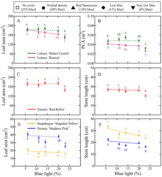 Key morphological metrics for lettuce ‘Rouxai’ and ‘Butter Crunch’ (A,B), tomato ‘Red Robin’ (C,D), and petunia ‘Madness Pink’ and snapdragon ‘Snapshot Yellow’ (E,F) as a function of the percentage of blue (400–499 nm) light in the transmitted spectrum of each treatment. Values indicate means ± 95% confidence intervals. The sample size for lettuce, tomato, and floriculture crops was 20, 24, and 25, respectively. Different letters within each crop are significantly different by Tukey’s honestly significant difference test (p < 0.05). Regressions were fit through the neutral density and two photoselective treatments (i.e., the red-fluorescent and greenhouse control treatments were omitted from the regression analysis). Regression equations are displayed in Tables S8–S12. Regressions with solid lines are significant at p < 0.05 and dashed lines are not.