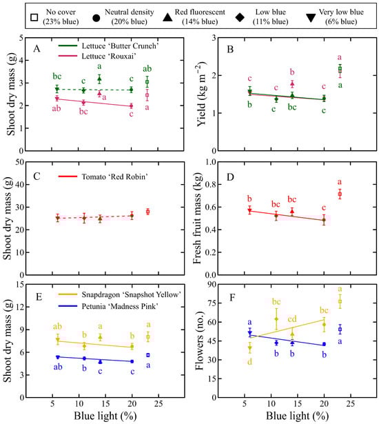 Key growth metrics for lettuce ‘Rouxai’ and ‘Butter Crunch’ (A,B), tomato ‘Red Robin’ (C,D), and petunia ‘Madness Pink’ and snapdragon ‘Snapshot Yellow’ (E,F) as a function of the percentage of blue (400–499 nm) light in the transmitted spectrum of each treatment. Values indicate means ± 95% confidence intervals. The sample size for lettuce, tomato, and floriculture crops was 20, 24, and 25, respectively. Different letters within each crop are significantly different by Tukey’s honestly significant difference test (p < 0.05). Regressions were fit through the neutral density and two photoselective treatments (i.e., the red-fluorescent and greenhouse control treatments were omitted from the regression analysis). Regression equations are displayed in Tables S8–S12. Regressions with solid lines are significant at p < 0.05 and dashed lines are not.