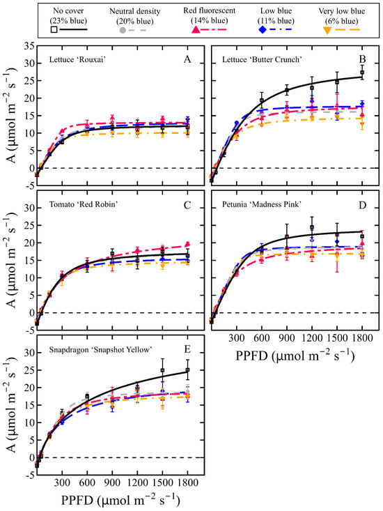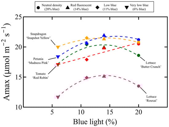 Maximum photosynthetic rate (Amax) for lettuce ‘Rouxai’ and ‘Butter Crunch’, tomato ‘Red Robin’, and petunia ‘Madness Pink’ and snapdragon ‘Snapshot Yellow’ as a function of the percentage of blue (400–499 nm) photons in the transmission spectrum of each treatment, excluding the uncover control treatment. Amax was derived from light response curves displayed in Figure 6 and Table S13.