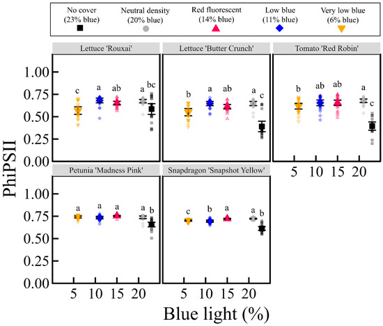 The average quantum yield of photosystem II (PhiPSII) of leaves near the top of the canopy on a cloudless day at solar noon (n = 20) as a function of the percentage of blue (400–499 nm) in the transmission spectrum of each treatment. The spectral characteristics of each treatment are displayed in Figure 1B and Supplementary Table S1. Different letters within each crop are significantly different by Tukey’s honestly significant difference test p < 0.05. Average values are displayed in Supplementary Table S14.