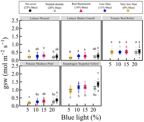 The average stomal conductance (gsw) of leaves near the top of the canopy on a cloudless day at solar noon (n = 20) as a function of the percentage of blue (400–499 nm) in the transmission spectrum of each treatment. The spectral characteristics of each treatment are displayed in Figure 1B and Supplementary Table S1. Different letters within each crop are significantly different by Tukey’s honestly significant difference test p < 0.05. Average values are displayed in Supplementary Table S14.
