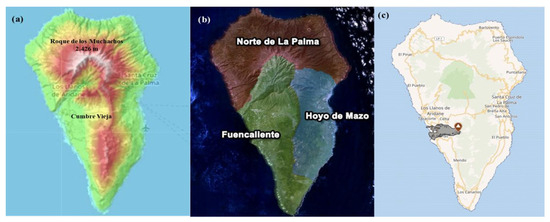 (a) Topographic map of La Palma Island [17]; (b) viticultural production zones of La Palma [18]; (c) mapped map of lava flow and extent [19].