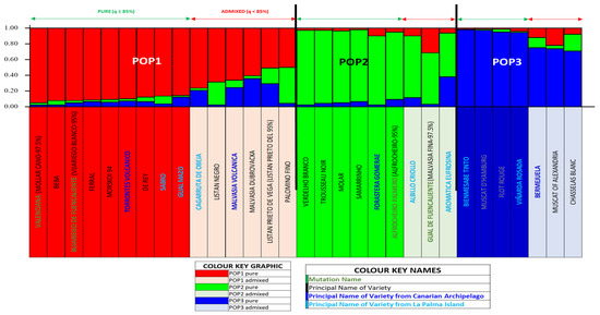 La Palma grapevine varieties population (unique molecular profiles). Structure 3.2. diagram: K = 3 distribution for pure and admixed individuals.
