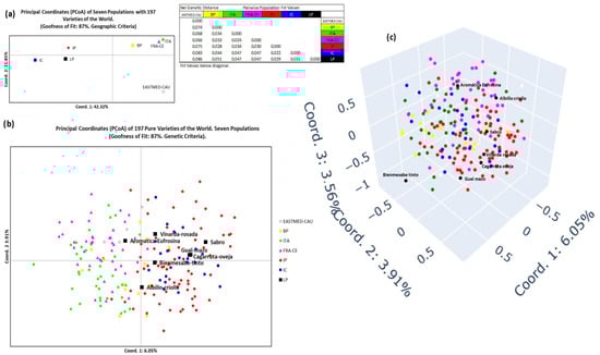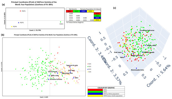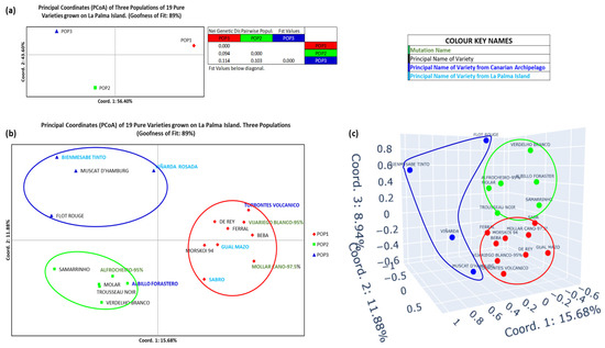 PCoA representation of the grapevine varieties population from La Palma Island normalized for K = 3. (a) Two-dimensional representation of the 3 populations. Values of the Fst statistic for each population. (b) Two-dimensional representation of the 3 populations by individuals. (c) Three-dimensional representation of the 3 populations by individuals.