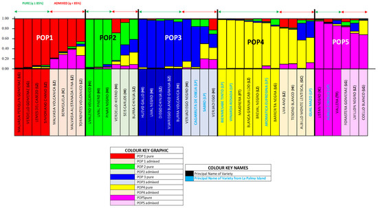 Figure 5 presents the graphical representation of the optimal distribution for the 40 varieties of the Canary Archipelago, corresponding to five ancestral populations. In addition, Figure S5 shows the distribution of these 40 varieties among the five populations according to their q values.