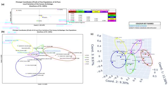 Population of varieties of the Canary Islands (22 pure varieties). (a) Two-dimensional representation of the 5 populations of the Canary Islands by population. Values of the Fst statistic for each population. (b) Two-dimensional representation of the 5 populations by individuals. (c) Three-dimensional representation of the 5 populations by individuals.