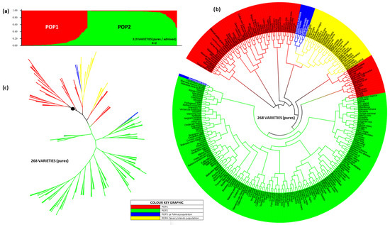 The circular dendrogram (Figure 7b) illustrates the distribution of the 268 pure varieties (including the two admixed LP varieties) across four clusters: POP1 (70), POP2 (161), IC (30), and LP (seven: five pure and two admixed). The IC population, nested within POP1, formed two sub-branches (in yellow). Within one of these, a further differentiation emerges, forming two smaller sub-branches, one of which comprised six LP varieties (in blue). The exception was Bienmesabe tinto, which clustered separately with POP2. This pattern also appeared in the phylogenetic tree (Figure 7c).