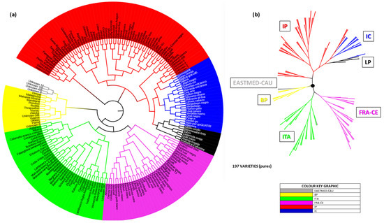 To validate the previous results, a geographic criterion was applied to the global grapevine dataset (319 varieties), grouping varieties into seven regions based on their countries of origin according to the VIVC database [51]. The decision to group by areas rather than individual countries was made because some countries were represented by only a single variety. The regions defined (Figure S8) were EASTMED-CAU (Algeria, Cyprus, Georgia, Israel, Lebanon, Tunisia, and Turkey), BP (Bosnia and Herzegovina, Bulgaria, Croatia, Greece, Serbia, Slovenia, and Montenegro), ITA (Italy), FRA-CE (Austria, France, Germany, Hungary, Ukraine, and Switzerland), IP (Spain and Portugal), IC, and LP.
