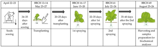 The experimental trial’s scheme is presented in Figure 1. Treatments were applied twice at the different plant phenological stages (BBCH). The spraying started when 4–6 leaves developed (1st spraying) at BBCH 16–17. The second spraying (2nd spraying) was performed at the beginning of head formation, when the youngest leaves had not unfolded at the BBCH 41 phenological stage. Spraying was performed manually using a hand sprayer Di Martino Lithium 8, nozzle pressure 2.8–3.8 atm.