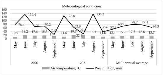 The average air temperature was similar at 16.2 and 16.4 °C during the cabbage vegetation period from May to August in both research years. The amount of precipitation was similar, reaching 75.0 and 78.8 mm, respectively (Figure 2). Differences occurred in different vegetation stages. The average temperature reaching 11.3 °C during the transplanting of cabbage seedlings in May 2020 and 2021 was lower than the multi-year average air temperature. The amount of precipitation this month was observed to be up to 126.8 mm in 2021 and up to 78.4 mm in 2020, while the multiannual average is 52.7 mm. The temperature in June was similar in both years. The highest temperature of 22.9 °C during the vegetation was determined in July 2021, when cabbage heads began to form. The temperature in June and July of 2020 reached 19.2 °C and 17.6 °C. The maximum amount of precipitation was observed in June, up to 134.4 mm in 2020, and up to 136.8 mm in August 2021 during the last phases of cabbage head growth.