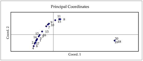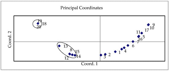 Scatter plot of cabbage nutritive elements (vitamin C, N, crude protein, crude fiber) applying different AAs and HAs and their combinations in different study years. 1—‘Bagočiai’ C, 2020; 2—‘Bagočiai’ T1, 2020; 3—‘Bagočiai’ T2, 2020; 4—‘Bagočiai’ T3, 2020; 5—‘Bagočiai’ T4, 2020; 6—‘Bagočiai’ C, 2021; 7—‘Bagočiai’ T1, 2021; 8—‘Bagočiai’ T2, 2021; 9—‘Bagočiai’ T3, 2021; 10—‘Bagočiai’ T4, 2021; 11—‘Kamienna Głowa’ C, 2020; 12—‘Kamienna Głowa’ T1, 2020; 13—‘Kamienna Głowa’ T2, 2020; 14—‘Kamienna Głowa’ T3, 2020; 15—‘Kamienna Głowa’ T4, 2020; 16—‘Kamienna Głowa’ C, 2021; 17—‘Kamienna Głowa’ T1, 2021; 18—‘Kamienna Głowa’ T2, 2021; 19—‘Kamienna Głowa’ T3, 2021; 20—‘Kamienna Głowa’ T4, 2021.