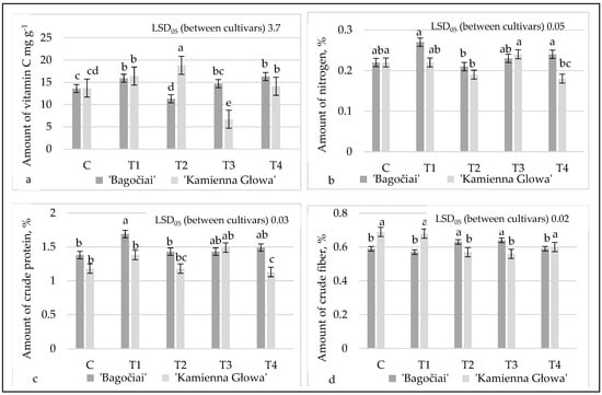 Effect of biostimulants on the quantitative parameters of nutritive elements ((a)—vitamin C, (b)—N, (c)—crude protein, (d)—crude fiber) of the cabbage, 2020—2021 mean values. C (control)-spraying with water; T1-HAs, sprayed twice; T2-AAs, sprayed twice; T3-AAs, 1st spraying + HAs, 2nd spraying; T4-HAs, 1st spraying + AAs, 2nd spraying. Means followed by the same letter do not differ significantly within the column at p = 0.05 (Duncan’s multiple range test).