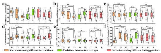 Variations in morphological indicators of Z. armatum fruits in response to harvest time, tree age and fruiting position. (a) Total phenols content. (b) Total flavonoids content. (c) Total carbohydrates content. (d) Soluble protein content. (e) Amino acids content. (f) Sanshool content. **, represent significant differences in the tested parameters, with a significance level of 0.01. *, represent significant differences in the tested parameters, with a significance level of 0.05, n.s., represent no significant differences in the tested parameters.