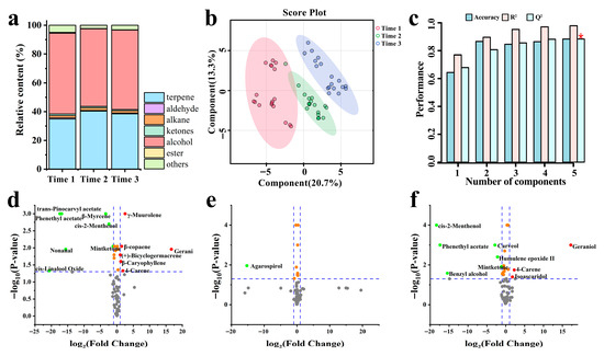 Analysis of VOCs at different harvest times. (a) Classification of VOC substances. (b) PLS-DA analysis. (c) Cross-validation results of the PLS-DA model. (d) VOC-Volcano plot analysis for HT1 and HT2. (e) VOC-Volcano plot analysis for HT1 and HT3. (f) VOC-Volcano plot analysis for HT2 and HT3. The red dots represent up-regulated substances with log2 (fold change) > 1, while the green dots represent down-regulated substances with log2 (fold change) < 1. The red asterisk in the cross-validation plot represent the predictive accuracy (Q2) of the PLS-DA model for each component number.