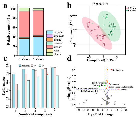 Analysis of VOCs of three-year and five-year trees. (a) Classification of VOC substances. (b) PLS-DA analysis. (c) Cross-validation results of the PLS-DA model. (d) VOC-Volcano plot analysis. The red dots represent up-regulated substances with log2 (fold change) > 1, while the green dots represent down-regulated substances with log2 (fold change) < 1. The corresponding substances are labeled in the figure. The red asterisk in the cross-validation plot represent the predictive accuracy (Q2) of the PLS-DA model for each component number.