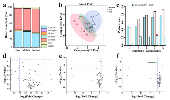 As shown in Figure 5, which depicts the changes in VOCs among different fruiting positions, as the fruiting position changes from the top to the bottom of the shoot, the content of terpene substances gradually decreases (Figure 5a). The PLS-DA score plot of the VOC dataset is shown in Figure 5b, which indicates an obvious similarity in VOCs among the three fruiting positions. Cross-validation results are presented in Figure 5c (R2 = 0.6794, Q2 = 0.3070). In the Volcano plot results, only α-Selinene was found to be more enriched at the Middle position compared to the Bottom position, with no significant substances identified in the Z. armatum fruits at other fruiting positions (Figure 5d–f). This indicates that the volatile components of fruits in different fruiting positions are similar.